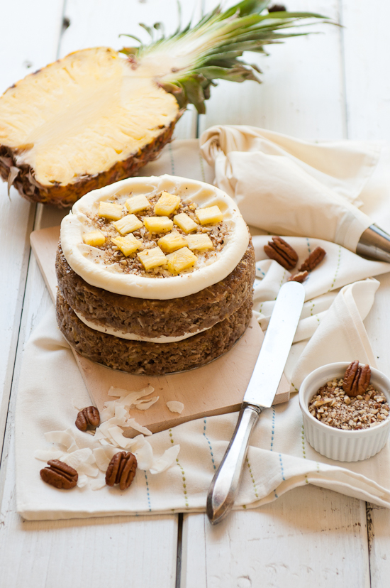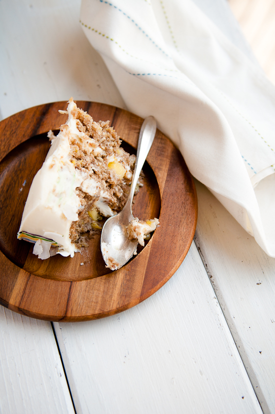 Here's my celebratory cake: a celebration hummingbird cake, with sweet, incredibly moist layers packed full of banana, pineapple, and coconut, with the nutty crunch of pecans and the slightly sour and salty finish of cream cheese frosting. Usually, I'm not a big fan of a million and one healthy ingredients invading my cake space, but for some reason, a hummingbird cake, dressed up with the addition of coconut, just seemed perfect for the season. There's something about the changing weather, the noticeably longer days, and the softer light in the evenings that just makes me really want to eat fruit and nuts and vegetables more than I did during the winter. And berry and stone fruit seasons are right around the corner!